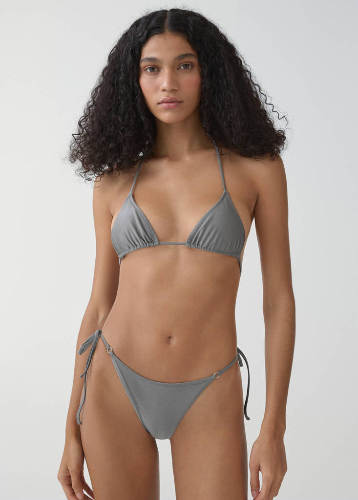 Tejido metalizado. Estilo tanga. Cierre de lazos ajustables. Forro interior. Conjunto disponible. Colección baño