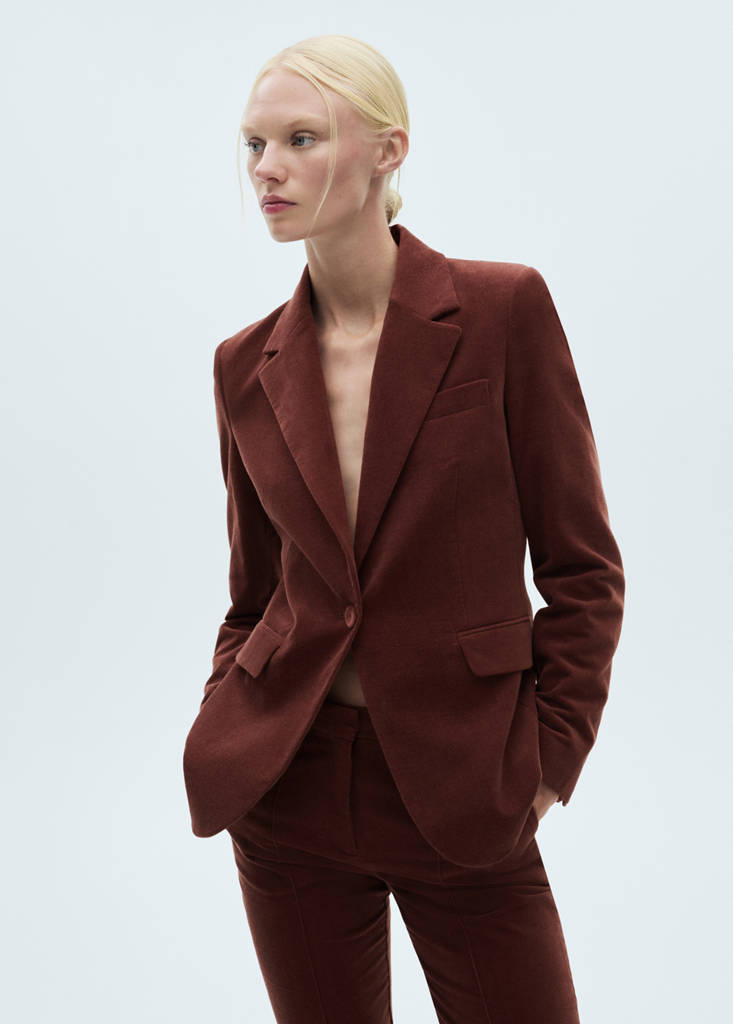 Tejido de terciopelo. Tejido 100% algodón. Diseño recto. Cuello pico con solapa. Manga larga abotonada. Cierre de botón en la parte delantera. Forro interior. Total look. Colección fiesta, ceremonia y comunión
