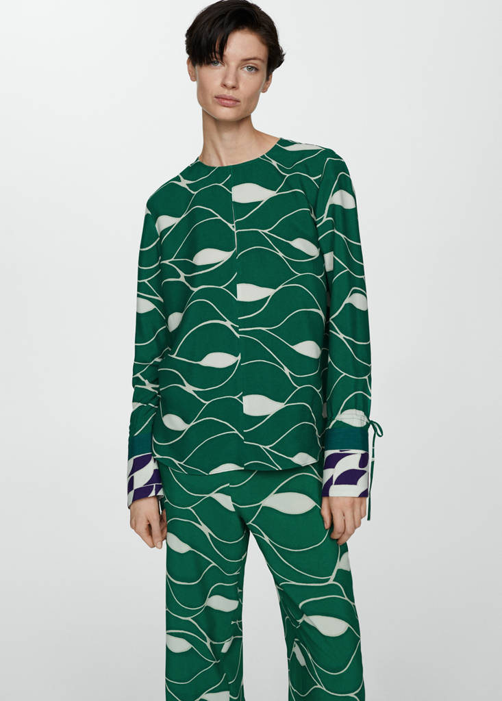 Tejido fluido. Diseño recto. Cuello redondo. Manga larga. Cierre de botón en la parte posterior. Detalle de lazos en los puños. Total look. Diseño estampado