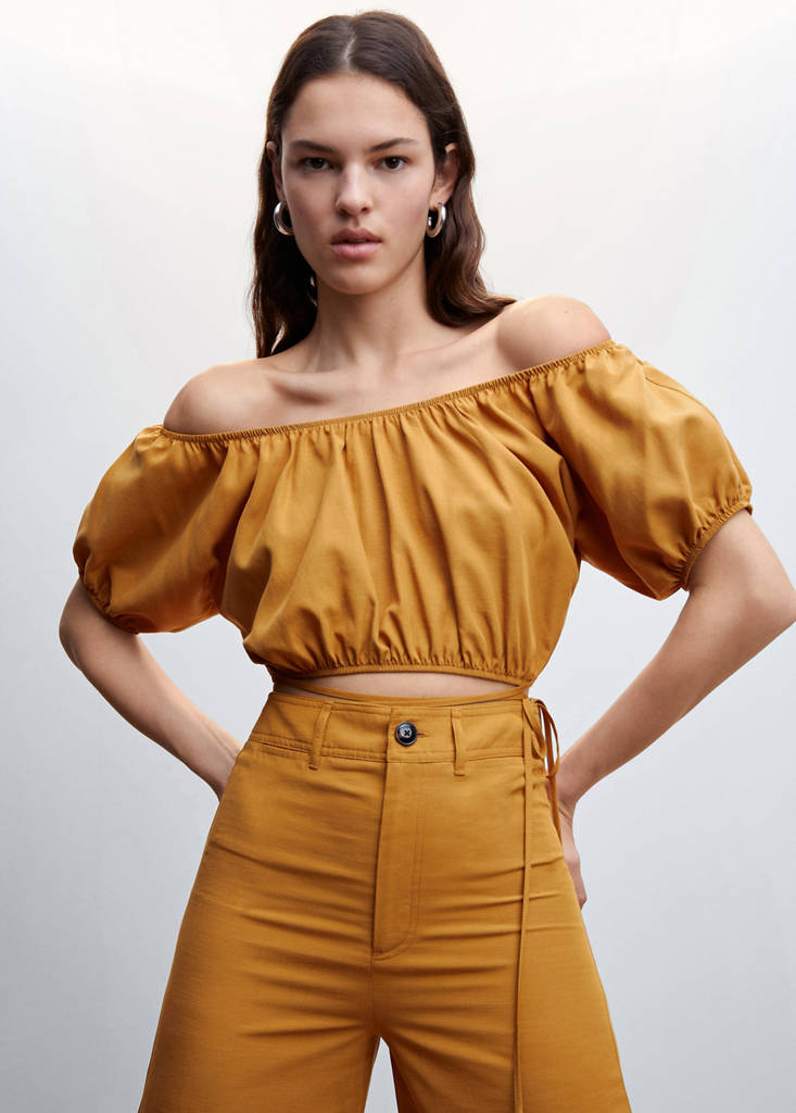 Tejido mezcla de algodón. Tejido fluido. Diseño corto. Diseño abullonado. Escote barco. Manga corta abullonada. Escote elástico. Elástico en el bajo. Detalles elásticos en las mangas. Cordón decorativo. Total look