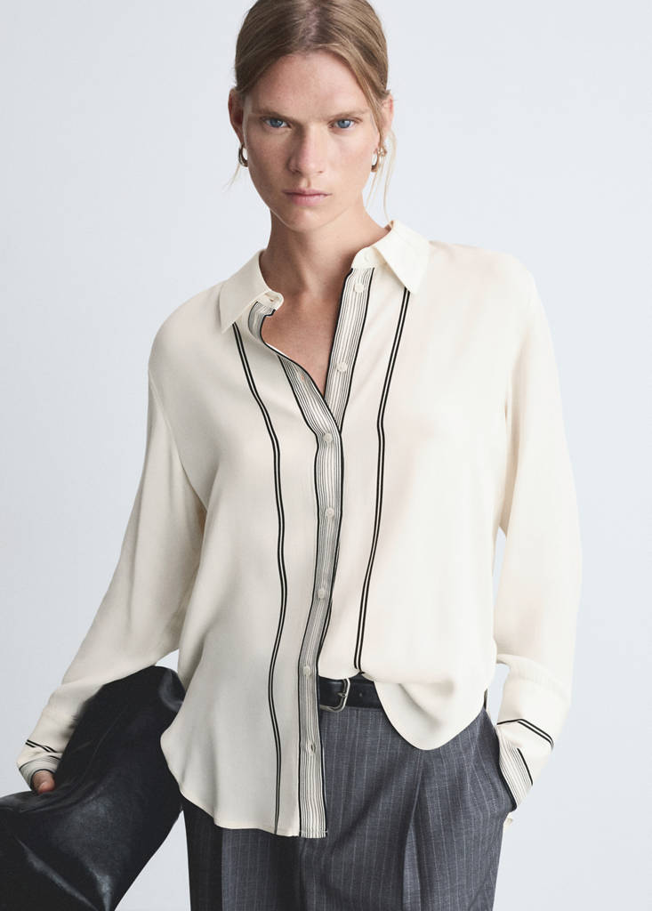 Tejido fluido. Cuello camisero. Manga larga con puños abotonados. Cierre delantero con botones. Detalle de rayas en contraste. Diseño recto