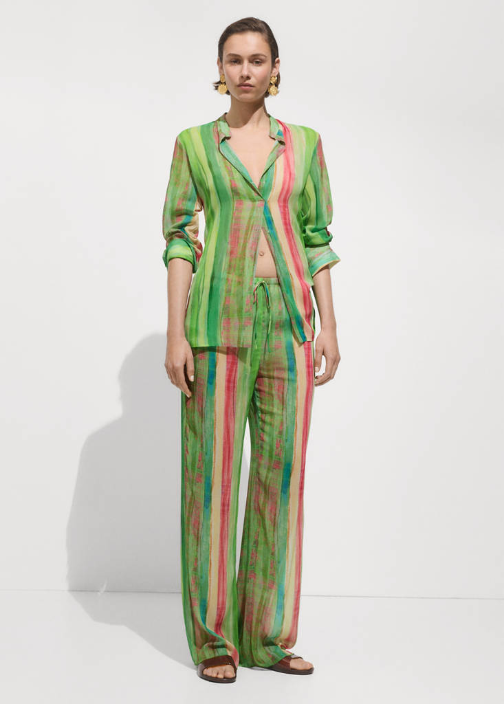 Tejido fluido. Tejido semitransparente. Diseño recto. Estampado de rayas. Manga larga con puños abotonados. Sin cierre. Total look. Festival Season