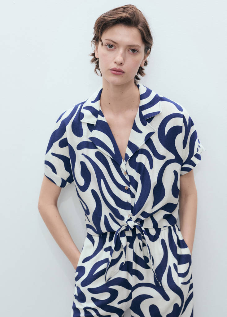 Diseño recto. Diseño crop. Estampado. Cuello camisero. Manga corta. Detalle de nudo en la parte delantera. Cierre delantero con botones. Disponible Plus