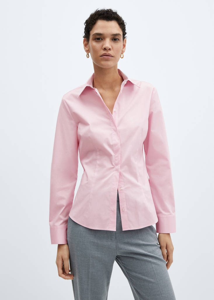 Tejido popelín de algodón. Estilo traje. Cuello camisero. Manga larga con puños abotonados. Cierre de botones en la parte delantera. Detalle de pinzas. Disponible Plus. Looks de oficina. Diseño entallado