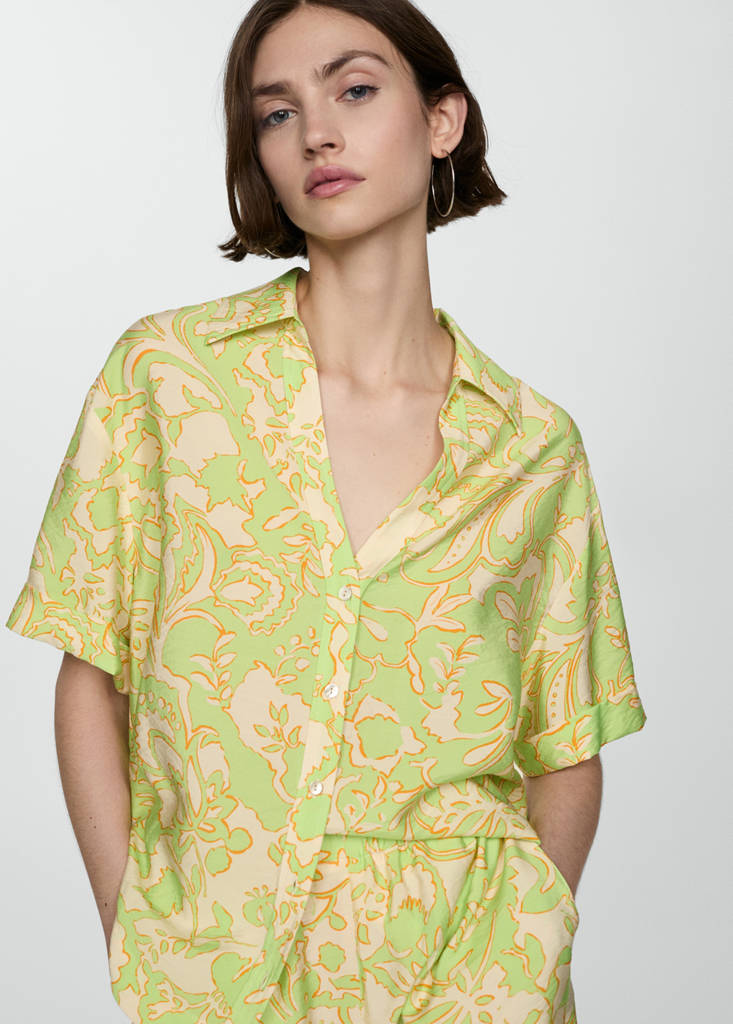 Tejido fluido. Diseño recto. Diseño oversize. Cuello camisero. Manga corta. Total look. Diseño estampado. Cierre delantero con botones