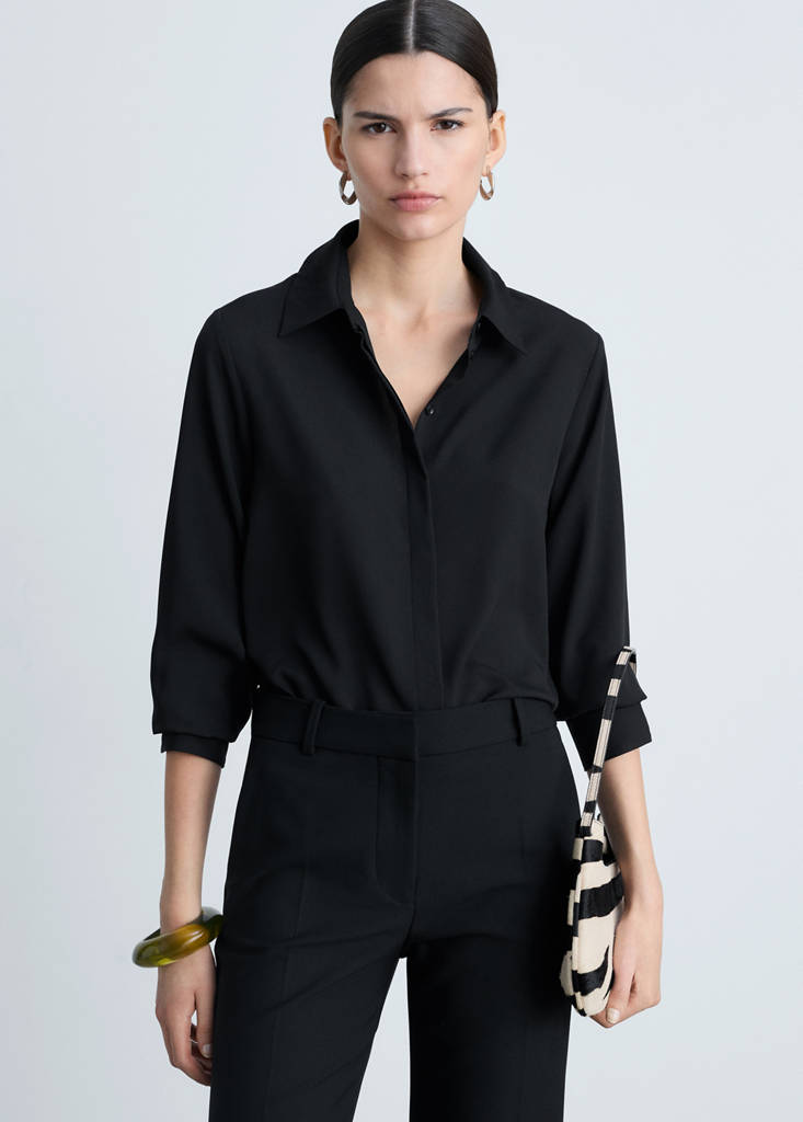 Tejido fluido. Diseño recto. Cuello camisero. Manga larga abotonada. Cierre de botones en la parte delantera. Disponible Plus. Manga larga con puños abotonados. Cierre delantero con botones