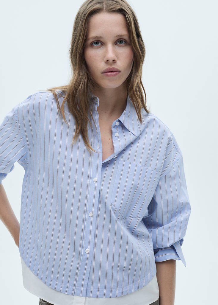Tejido popelín de algodón. Tejido mezcla algodón y lyocell. Diseño recto. Diseño combinado. Estampado de rayas. Cuello camisero. Manga larga con puños abotonados. Bajo en contraste. Disponible Plus. Cierre delantero con botones