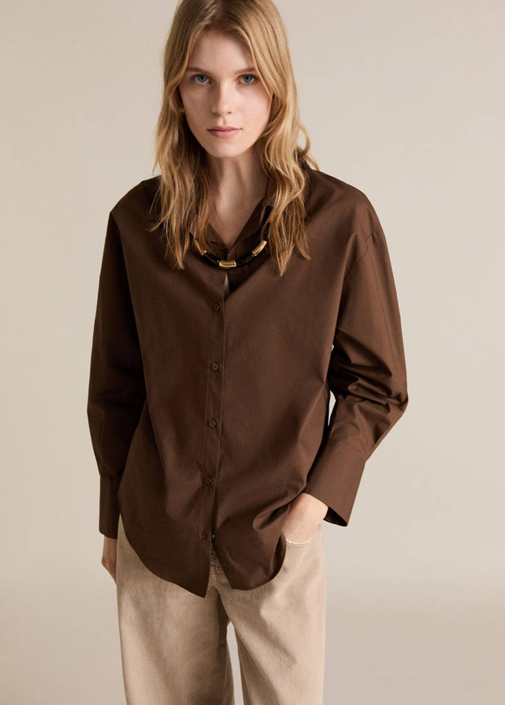 Tejido 100% algodón. Diseño recto. Regular fit. Cuello camisero. Manga larga con puños abotonados. Cierre de botones en la parte delantera