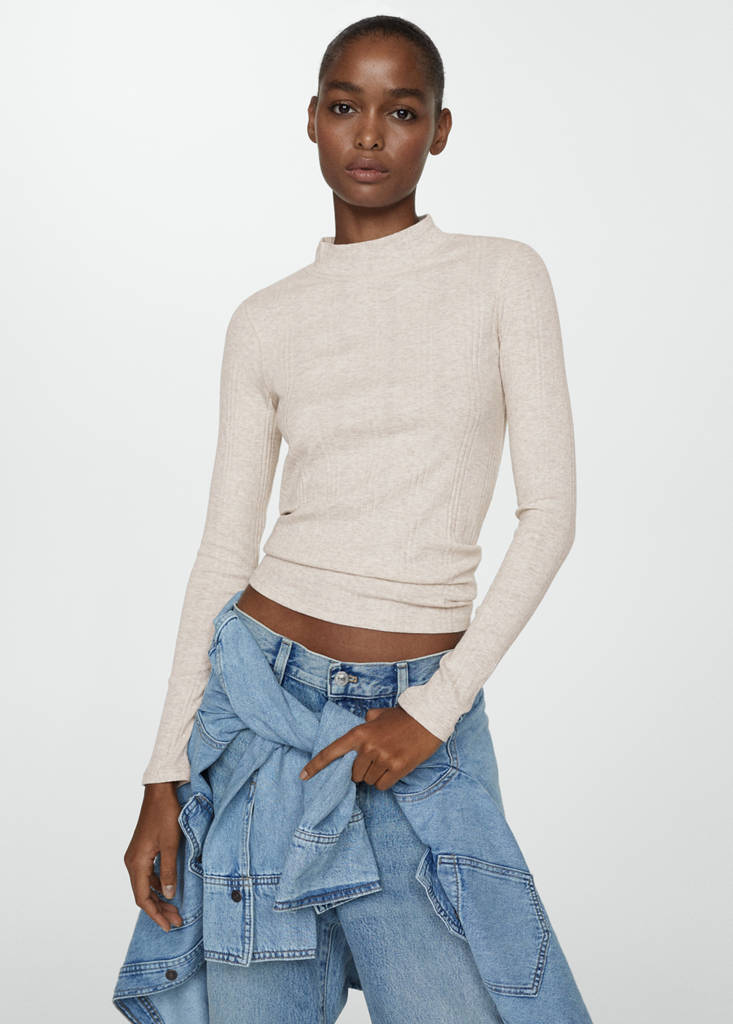 Tejido mezcla de algodón. Tejido de punto de canalé. Diseño recto. Cuello perkins. Manga larga. Sin cierre