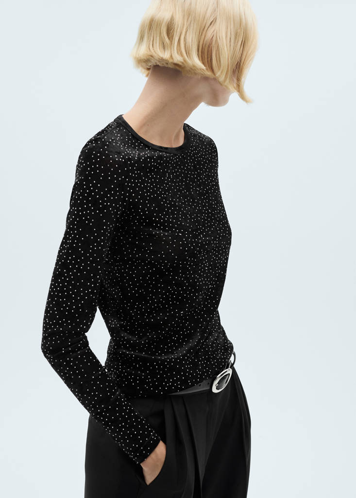 Tejido fluido. Detalle de strass. Diseño entallado. Cuello redondo. Manga larga. Sin cierre. Colección fiesta, ceremonia y comunión