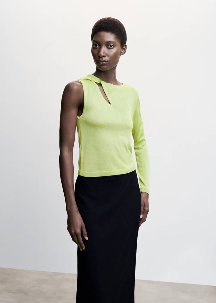 Tejido de punto fino. Tejido fluido. Diseño asimétrico. Diseño recto. Escote asimétrico. Cuello redondo. Manga larga. Detalle de abertura. Terminaciones de canalé. Festival Season