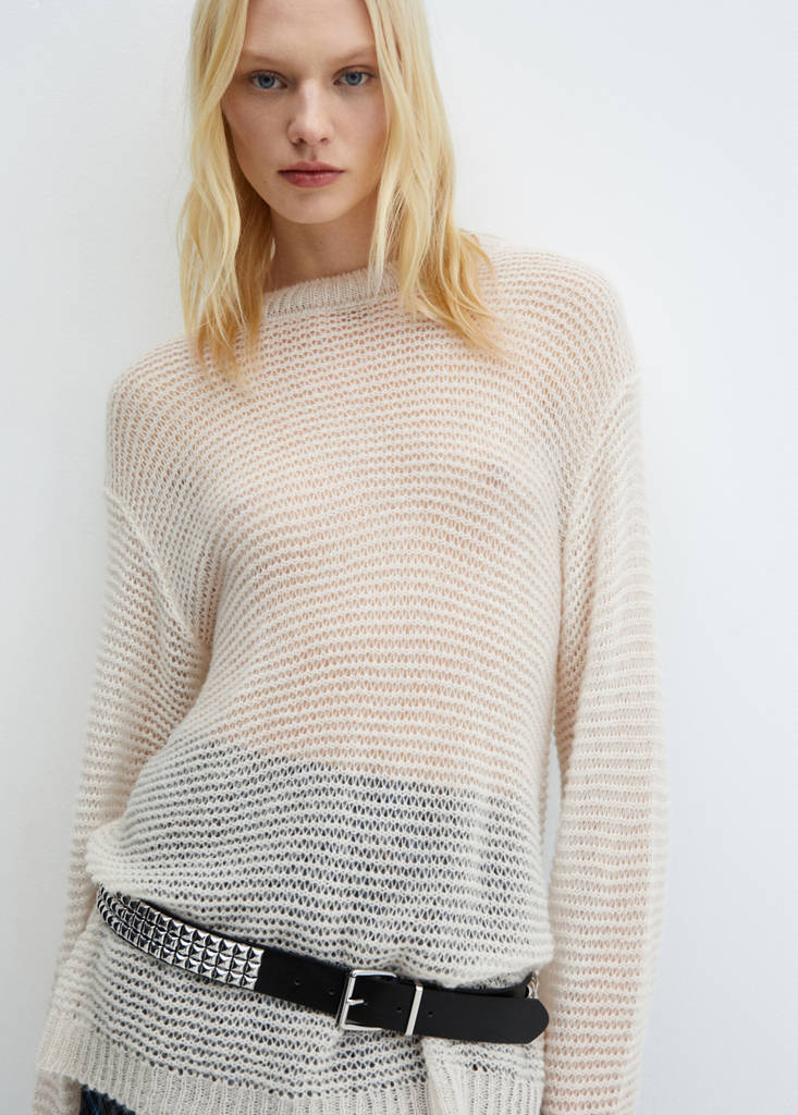 Tejido mezcla de alpaca. Punto medio. Diseño oversize. Diseño calado. Cuello redondo. Manga larga. Sin cierre. Terminaciones en canalé