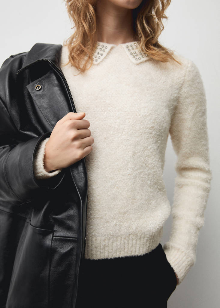 Tejido de punto. Diseño recto. Cuello polo. Detalle de strass. Manga larga. Sin cierre