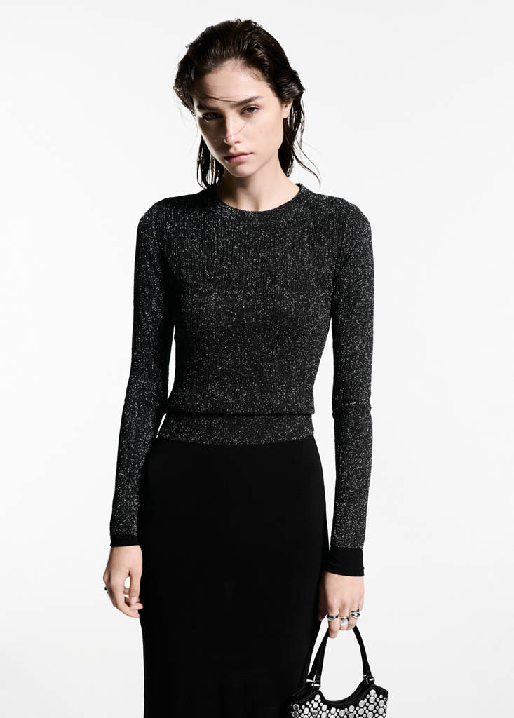 Jersey lúrex cuello redondoHistórico de preciosPrecio inicial tachado [25,99 € ]25,99 €Segundo precio tachado [19,99 € ]19,99 €Precio actual [12,99 € ]12,99 €-50 %Selecciona un colorNegroLa modelo lleva la talla S y mide 177cm.Selecciona tu tallaXXSNo disponible ¡Lo quiero!XSS¡Últimas unidades!MNo disponible ¡Lo quiero!LNo disponible ¡Lo quiero!XLNo disponible ¡Lo quiero!XXLNo disponible ¡Lo quiero!MedidasAñadirManga larga. Tejido de punto fino. Tejido de lurex. Diseño entallado. Sin cierre. Colección fiesta, ceremonia y comunión. Cuello redondoDetalles, composición y cuidadosDisponibilidad en tienda