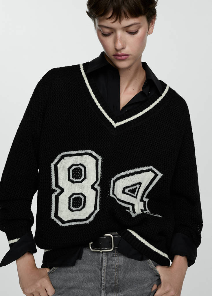 Tejido de punto grueso. Diseño oversize. Diseño largo. Cuello pico. Manga larga. Mensaje en contraste. Detalle pipping en contraste