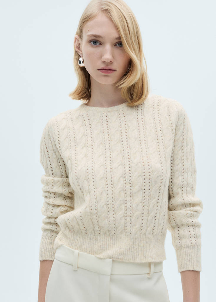 Tejido de punto grueso. Tejido de punto calado. Tejido punto trenzado. Diseño recto. Cuello redondo. Terminaciones de canalé