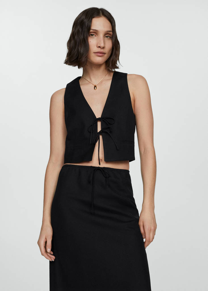 Tejido mezcla de lino. Tejido fluido. Diseño recto. Diseño corto. Cuello pico. Sin mangas. Cierre de lazos en la parte delantera. Total look. Festival Season. Dos bolsillos de ribete en la parte delantera