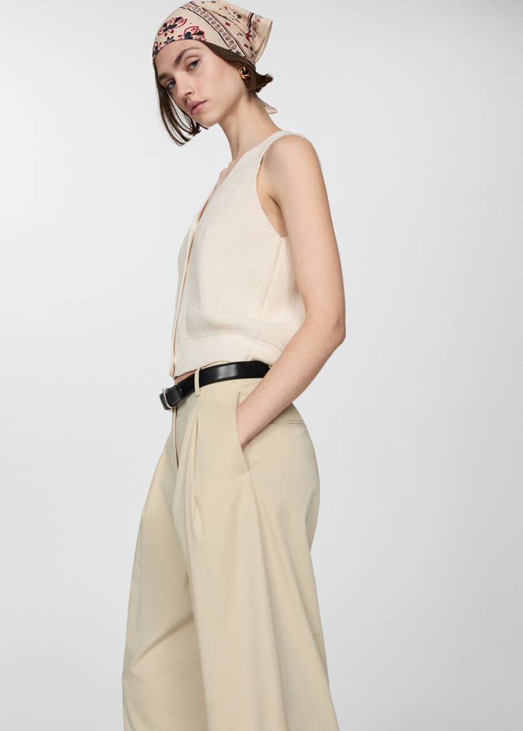 Tejido mezcla de algodón. Tejido de punto de canalé. Punto medio. Diseño recto. Cuello pico. Sin mangas. Cierre delantero con botones