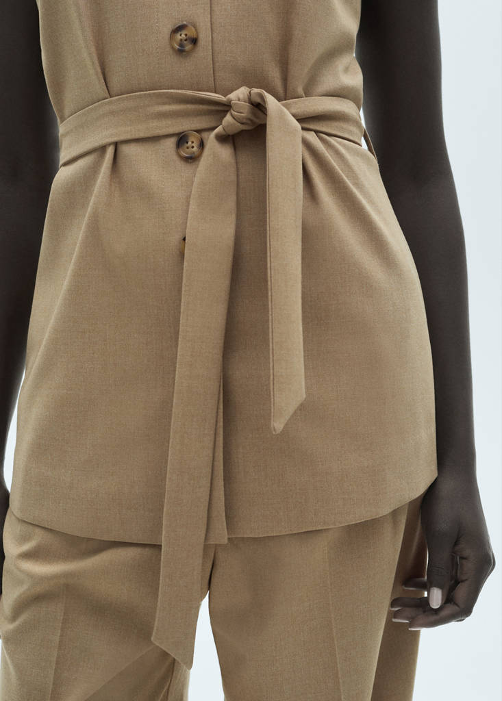 Diseño largo. Sin mangas. Cierre de botones en la parte delantera. Forro interior. Total look. Cuello camisero. Diseño recto. Lazo a la cintura