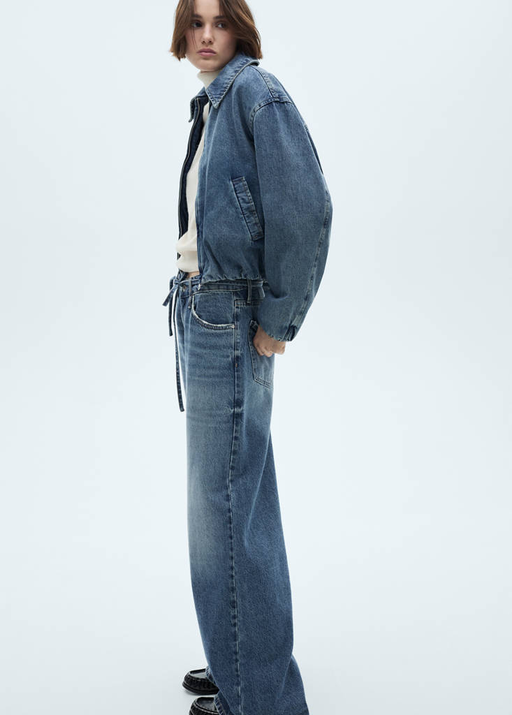 Tejido de algodón estilo tejano vaquero. Diseño bomber. Diseño crop. Cuello camisero. Manga larga con puños elásticos. Bolsillos laterales. Cierre de cremallera en la parte delantera