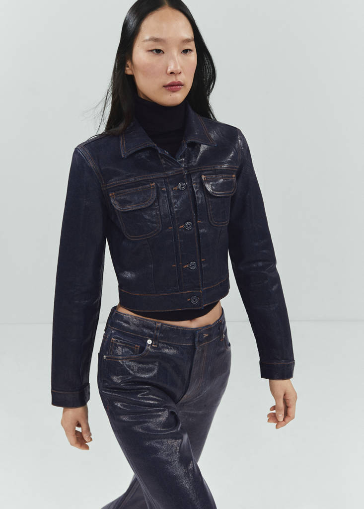 Tejido de algodón estilo tejano vaquero. Acabado foil transparente. Cuello camisero. Manga larga. Dos bolsillos de solapa en el pecho. Costuras decorativas. Cierre delantero con botones. Diseño entallado