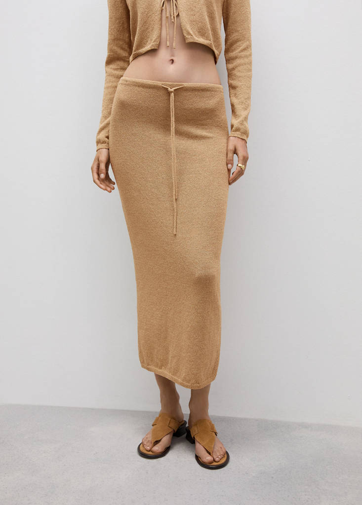 Tejido de punto grueso. Diseño largo. Cintura elástica con cierre de lazo. Forro interior. Total look. Diseño entallado