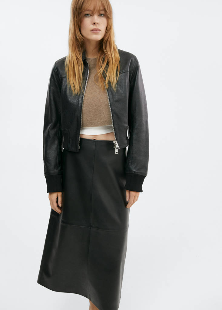 100% piel ovino. Diseño midi. Diseño evasé. Cierre de cremallera invisible en la parte posterior. Detalle de abertura en la parte posterior. Costuras decorativas. Forro interior. Total look. Looks de oficina. Colección Selection