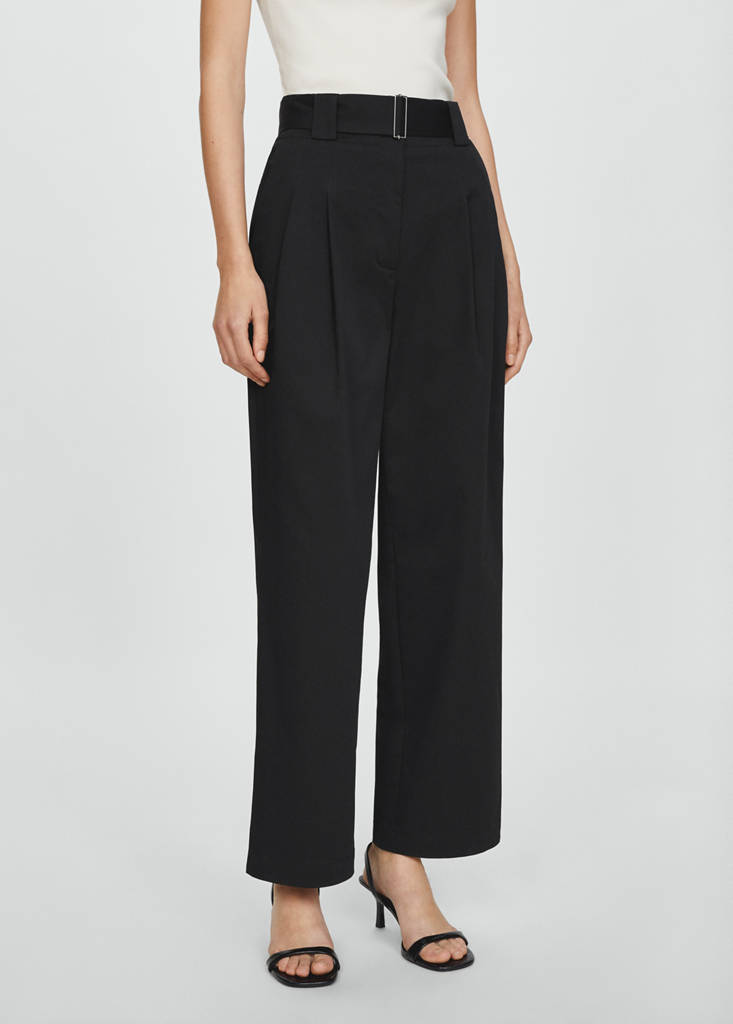 Tejido mezcla de algodón. Diseño largo. Diseño recto. Dos bolsillos laterales. Dos bolsillos de ribete en la parte posterior. Cierre oculto de botón, gancho y cremallera. Trabillas. Cinturón desmontable