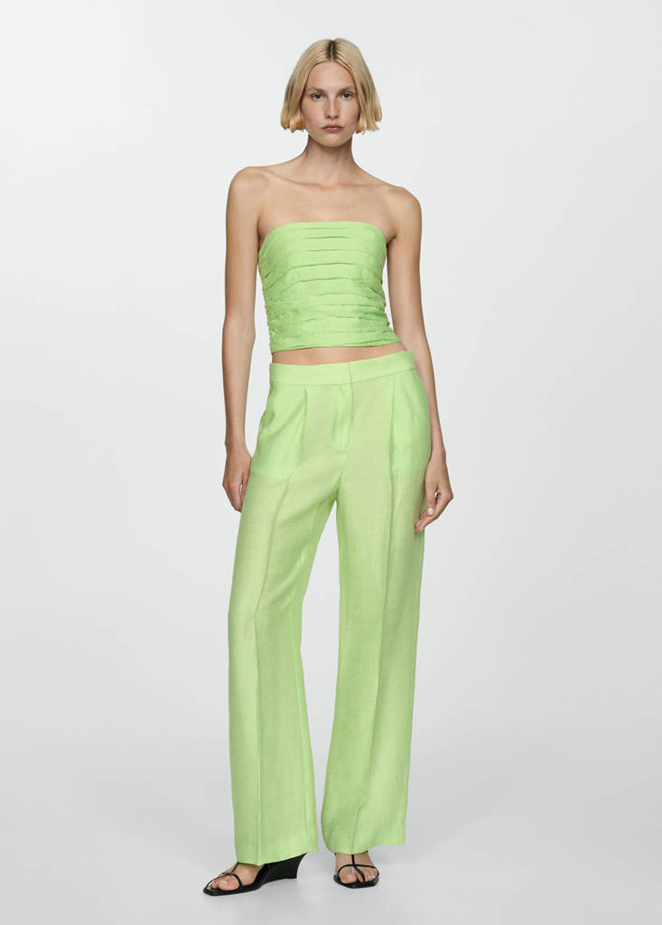 Tejido mezcla de lino y lyocell. Diseño drapeado. Diseño crop. Palabra de honor. Sin mangas. Panel nido de abeja. Cierre de cremallera en la parte posterior. Total look. Forro interior. Colección fiesta, ceremonia y comunión. Diseño entallado