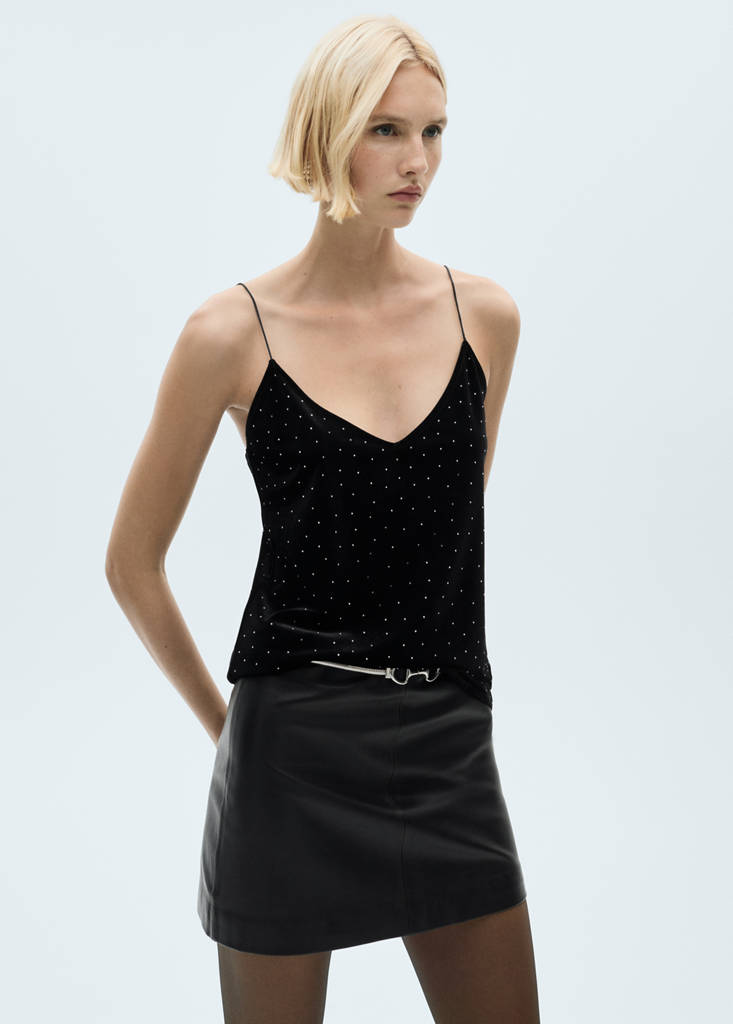 Tejido de terciopelo. Diseño recto. Cuello pico. Tirantes finos. Detalle de strass. Sin cierre. Colección fiesta, ceremonia y comunión