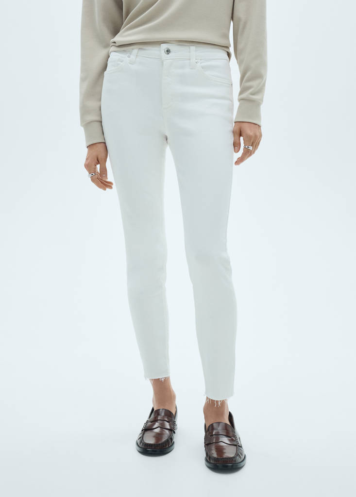 Tejido de algodón estilo tejano vaquero. Tejido elástico. Corte skinny. Diseño crop. Tiro medio. Trabillas. Cinco bolsillos. Cierre de cremallera y botón. Terminaciones deshilachadas. Largo interior 68 cm. Disponible Plus