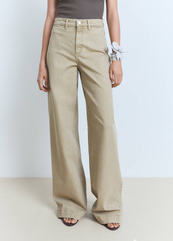 Tejido de algodón estilo tejano vaquero. Tejido elástico. Diseño largo. Full length. Diseño wideleg. Tiro alto. Trabillas. Dos bolsillos de parche en la parte posterior. Cierre delantero de cremallera y botón