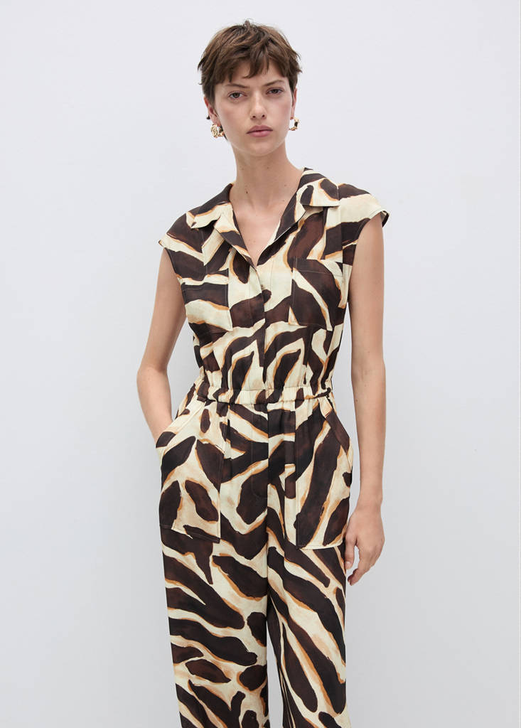 Tejido fluido. Diseño largo. Diseño recto. Estampado animal print. Cuello camisero. Sin mangas. Cintura con goma elástica. Dos bolsillos de parche en la parte delantera. Disponible Plus. Cierre delantero de botones oculto