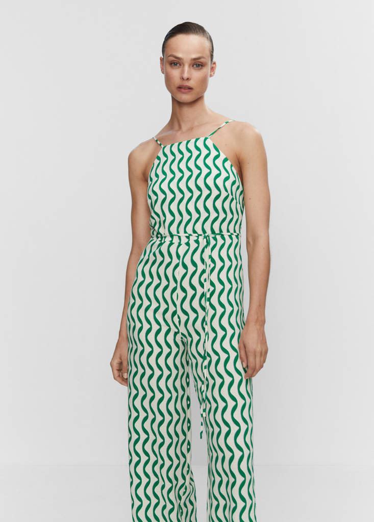 Tejido fluido. Estampado geométrico. Diseño largo. Diseño recto. Escote halter. Tirantes finos ajustables. Abertura en la espalda. Cierre cremallera invisible en el lateral. Detalle de pinzas. Cinturón decorativo