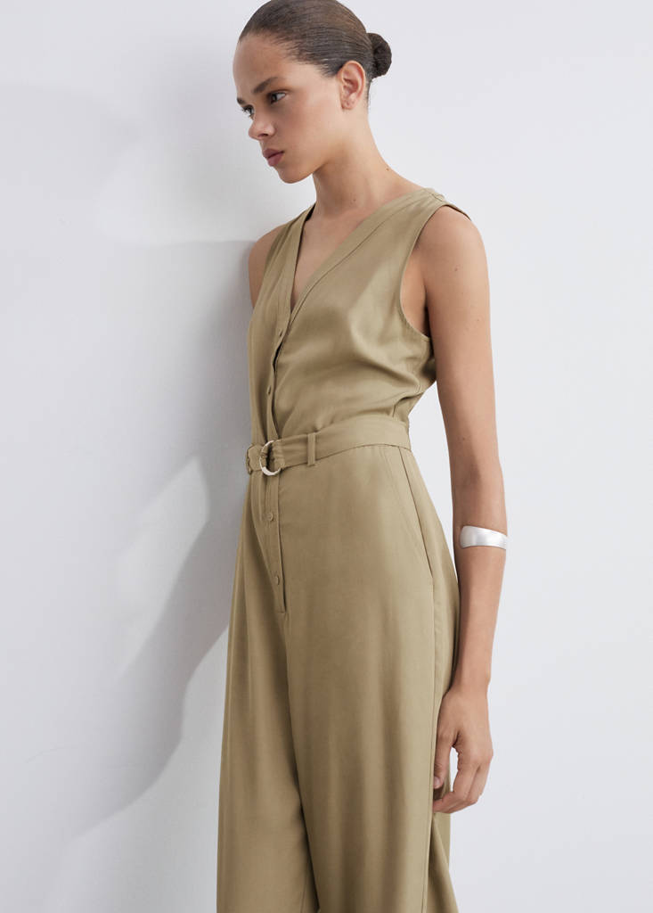 Tejido mezcla de lino y lyocell. Diseño recto. Diseño largo. Escote de pico. Sin mangas. Tirantes anchos. Dos bolsillos laterales. Trabillas. Cinturón decorativo. Disponible Plus. Cierre delantero con botones