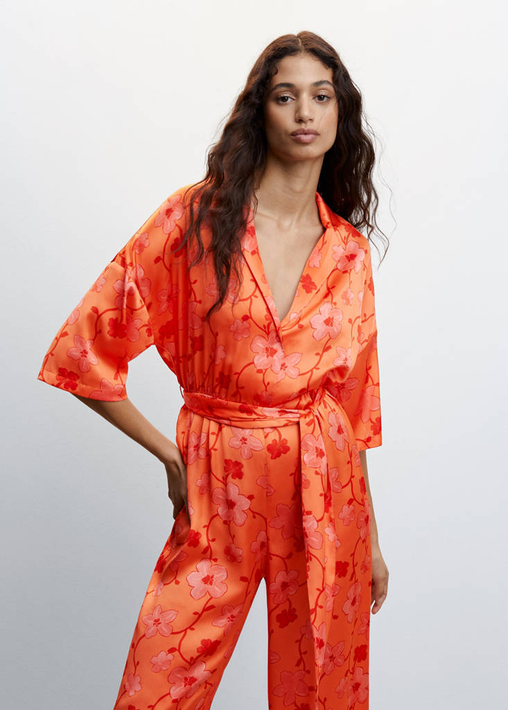 Tejido fluido. Tejido satinado. Estampado de flores. Diseño largo. Diseño recto. Cuello pico con solapa. Manga tres cuartos. Trabillas. Cinturón decorativo