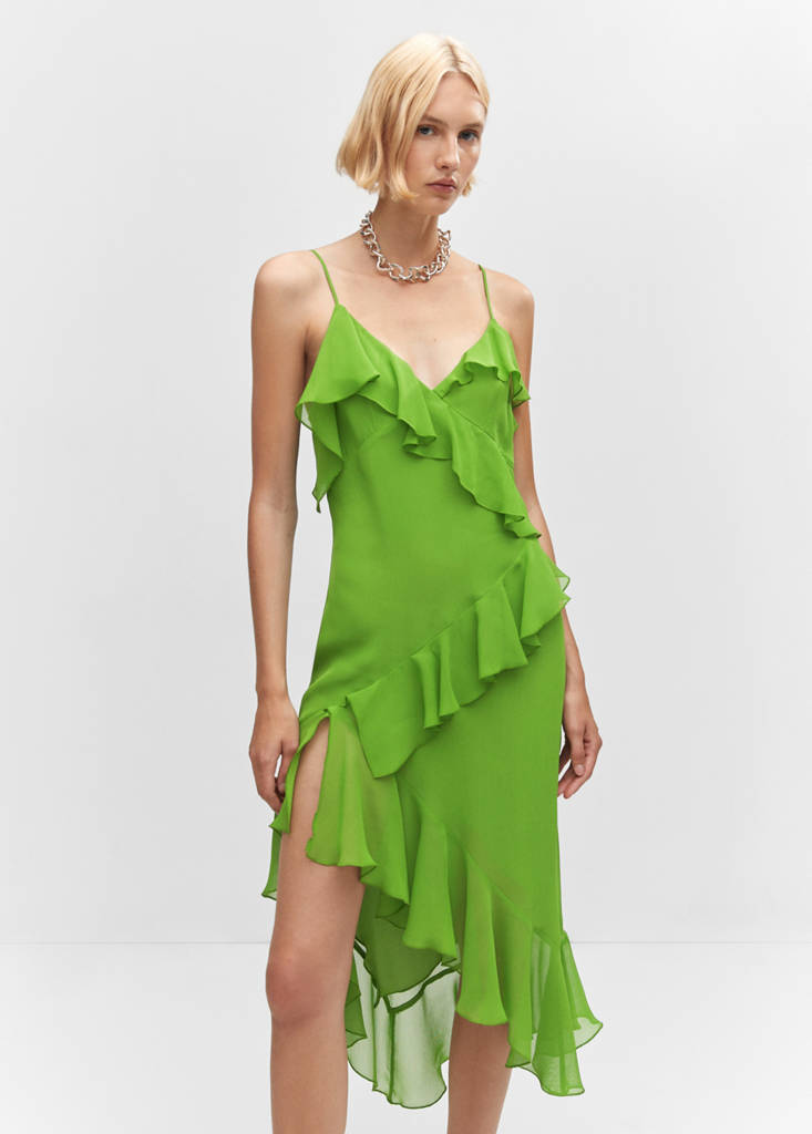 Tejido de gasa. Tejido fluido. Diseño asimétrico. Diseño midi. Cuello escotado. Tirantes finos. Espalda con escote. Cierre de cremallera. Detalle de volantes. Forro interior. Colección fiesta, ceremonia y comunión. Diseño entallado