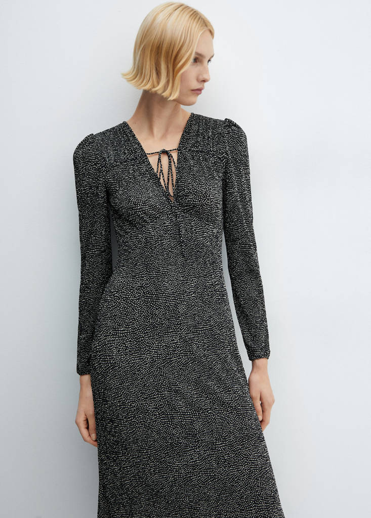 Tejido fluido. Diseño midi. Diseño evasé. Escote de pico. Escote con cierre de lazo. Manga larga con puños elásticos. Disponible Plus. Diseño estampado