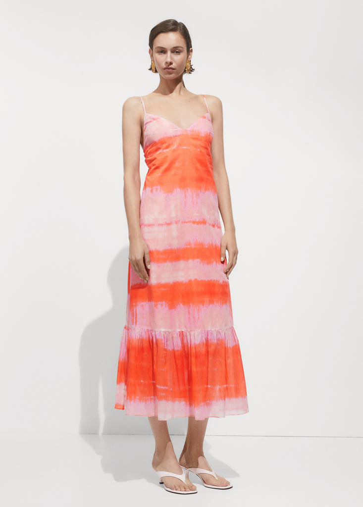 Diseño evasé. Diseño largo. Escote de pico. Sin mangas. Tirantes finos. Sin cierre. Bajo con volante. Diseño estampado. Tejido 100% algodón