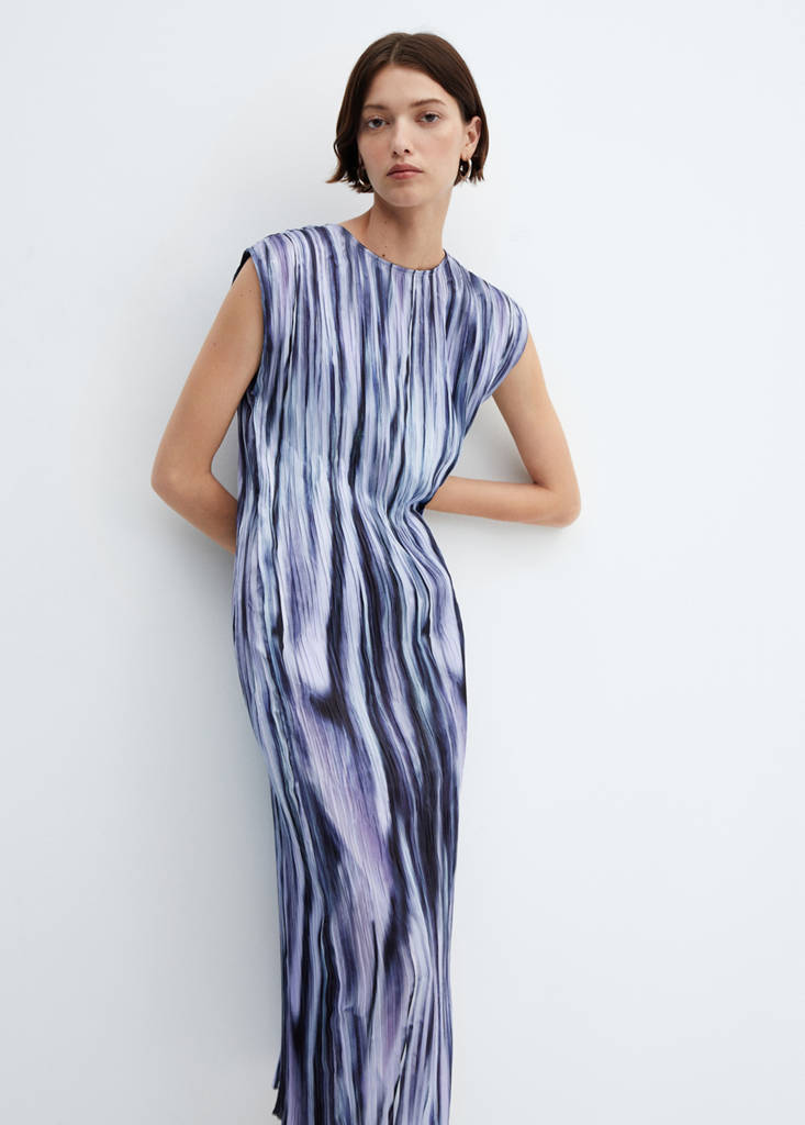 Tejido fluido. Tejido plisado. Diseño midi. Diseño recto. Estampado tie-dye. Efecto arrugado. Cuello redondo. Sin mangas. Cierre de botón en la parte posterior. Colección fiesta, ceremonia y comunión