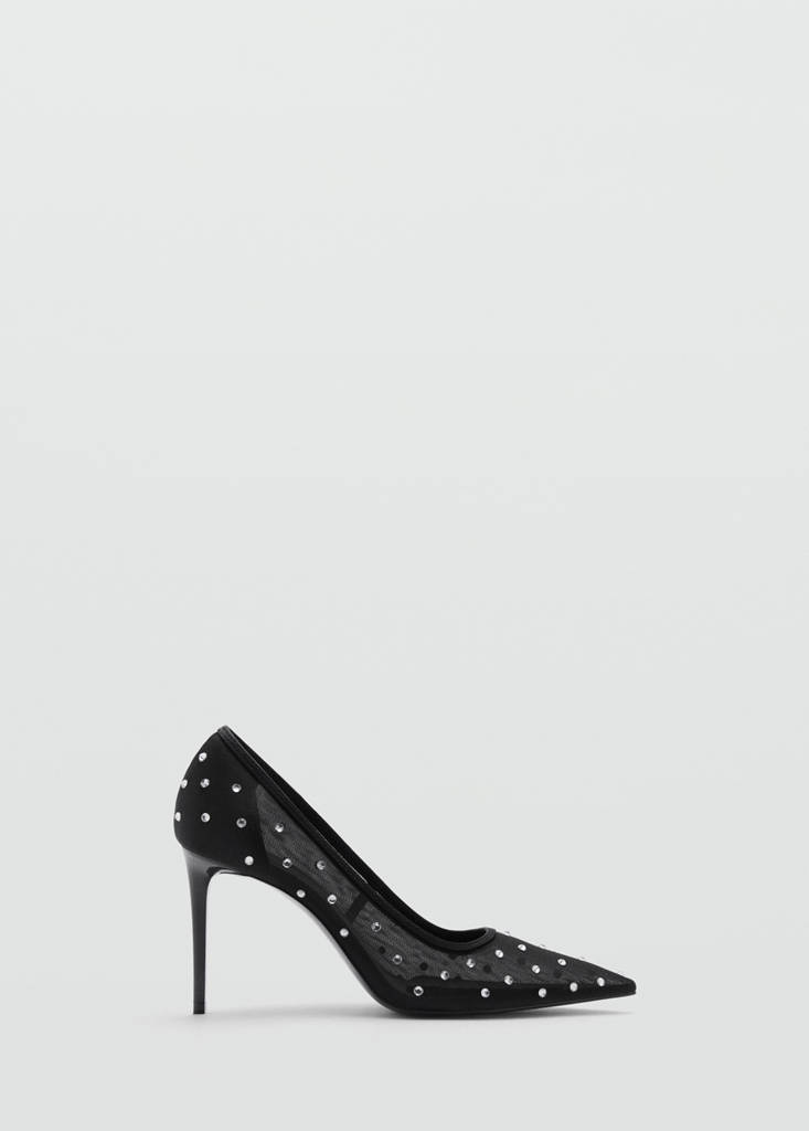 Tejido de malla. Malla con brillos. Tacón de aguja. Con punta. El tacón mide 8 cm. Tacón alto