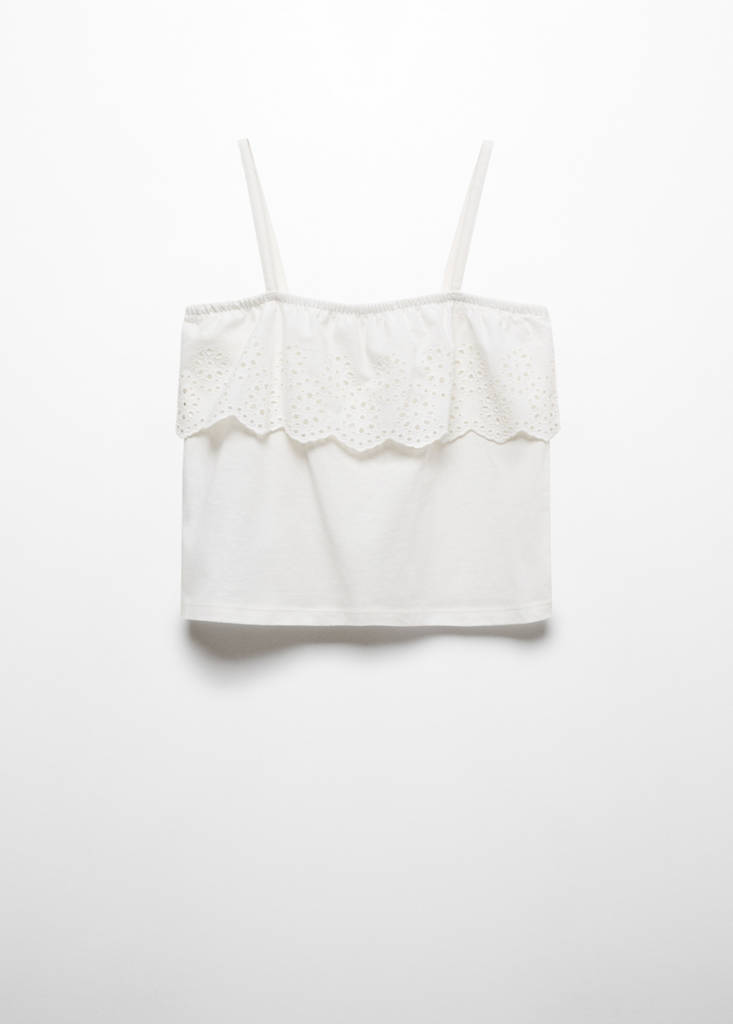 100% algodón. Bordado suizo. Diseño recto. Diseño crop. Tirantes finos. Cuello cuadrado. Sin mangas