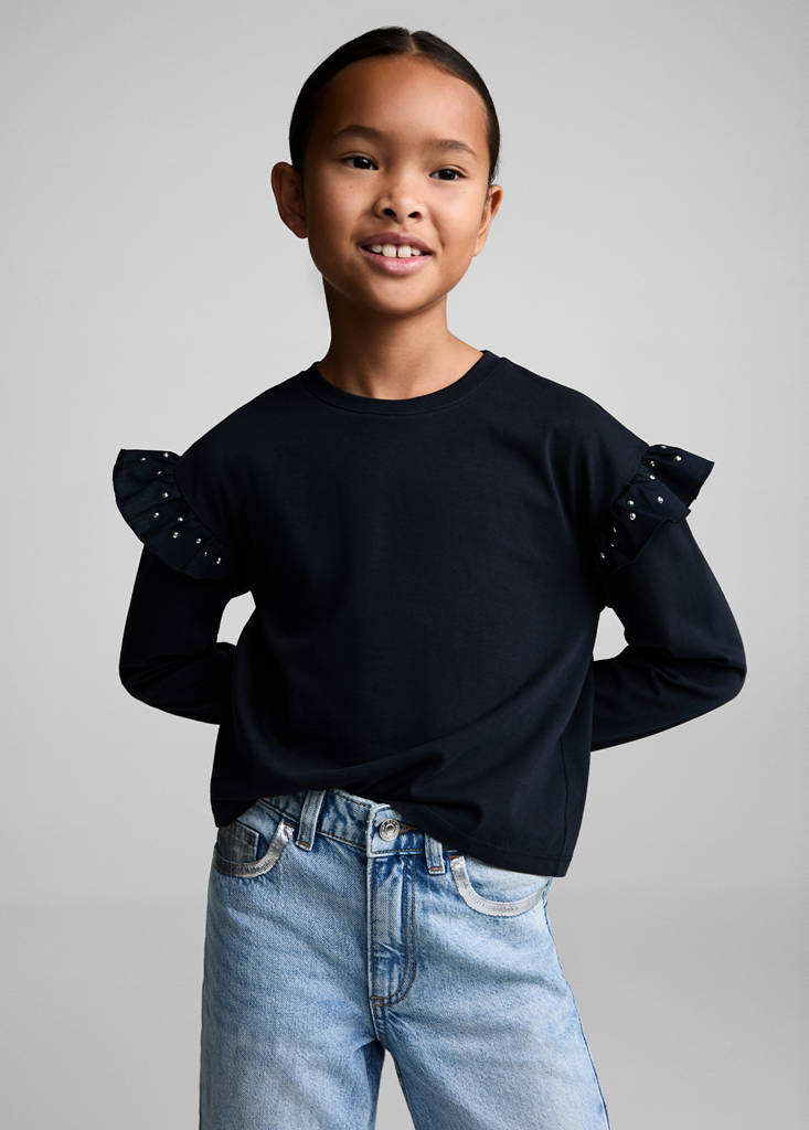 Camiseta volantes tachuelasHistórico de preciosPrecio inicial tachado [14,99 € ]14,99 €Segundo precio tachado [11,99 € ]11,99 €Precio actual [5,99 € ]5,99 €-60 %Selecciona un colorAzul marino oscuroSelecciona tu talla5-6 años (116cm)7-8 años (128cm)No disponible ¡Lo quiero!9-10 años (140cm)No disponible ¡Lo quiero!11-12 años (152cm)No disponible ¡Lo quiero!13-14 años (164cm)No disponible ¡Lo quiero!MedidasAñadirVuelta a clase. 100% Algodón. Diseño recto. Cuello redondo. Manga larga. Tachuelas decorativas. Detalle de volantesDetalles, composición y cuidadosDisponibilidad en tienda