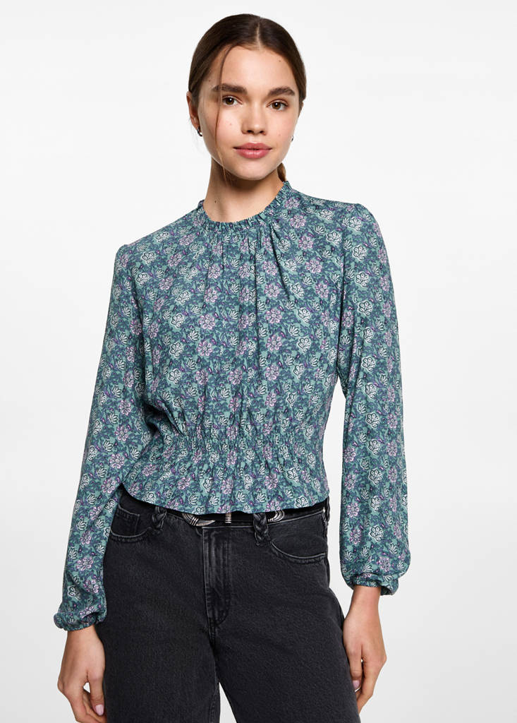 Manga larga. Cuello redondo. Tejido fluido. Estampado floral. Cuello fruncido. Fruncido elástico en la cintura. Puños elásticos. Cierre de lágrima en la parte posterior