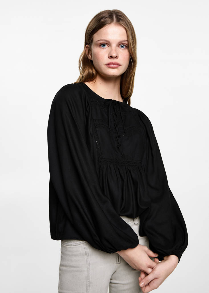 Cuello redondo. Paneles de encaje. Manga larga abullonada. Cierre de lazo en el cuello. Puños fruncidos. Cintura fruncida