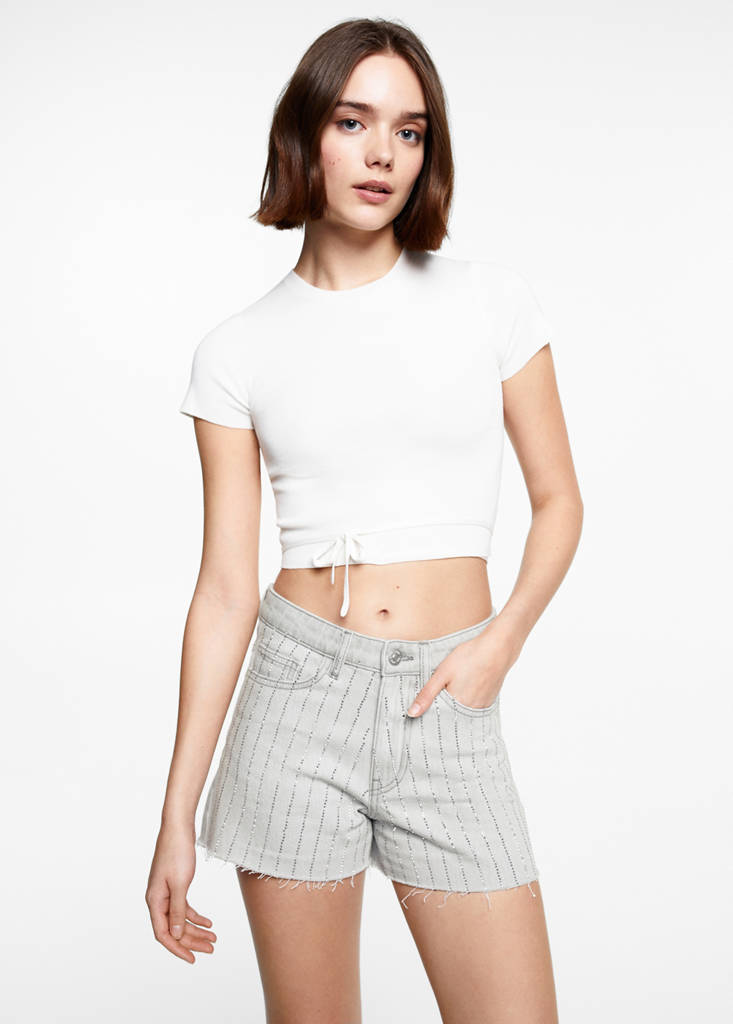 Tejido de algodón estilo tejano vaquero. Diseño corto. Tiro medio. Aplique brillos. Cinco bolsillos. Cierre de cremallera y botón