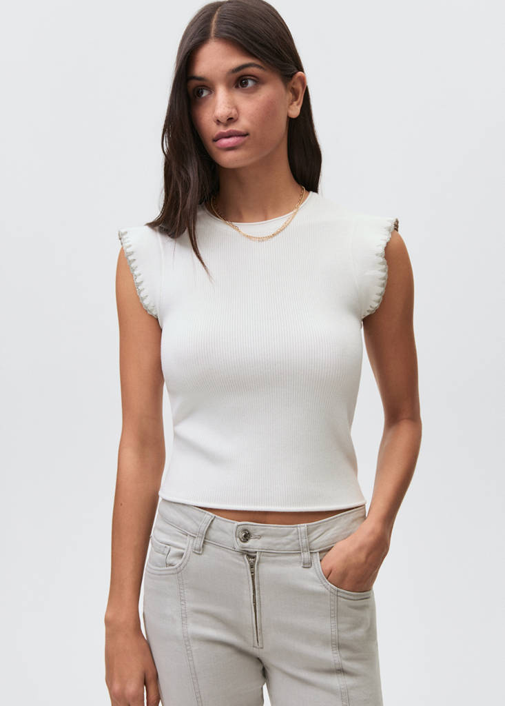 Tejido de algodón estilo tejano vaquero. Cinco bolsillos. Costuras decorativas. Trabillas. Cierre de botón y cremallera. Bajo deshilachado