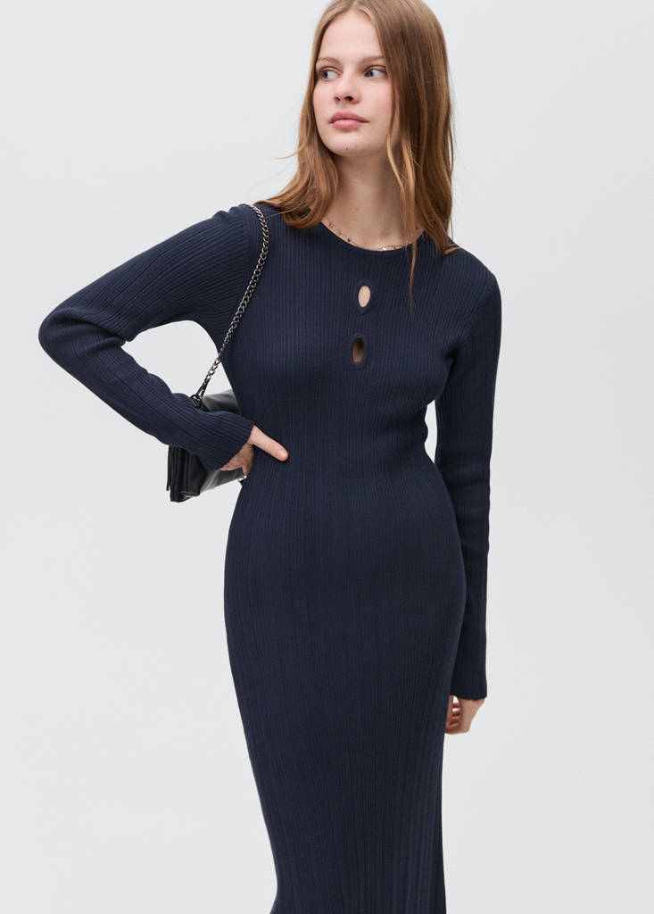 Diseño largo. Punto de canalé. Diseño entallado. Detalle calado. Manga larga. Cuello redondo. Sin cierre