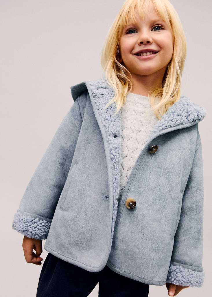 Hood. Long sleeves. Two side pockets. Front closure with buttons. Faux shearling interior. Straight design