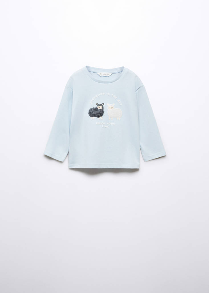 Long-sleeved t-shirt with sequinsPrice historyInitial price struck through [€ 12,99 ]€ 12,99Current price [€ 9,99 ]€ 9,99-23 %Select a colourSky BlueSelect your size9-12 months (80cm)Not available. I want it!12-18 months (86cm)Not available. I want it!18-24 months (92cm)Not available. I want it!2-3 years (98cm)Not available. I want it!3-4 years (104cm)Not available. I want it!4-5 years (110cm)Not available. I want it!DimensionsNotify me100% Cotton. Decorated with sequins. Straight design. Round neck. Long sleeves. Printed designDetails, composition and careStore availability